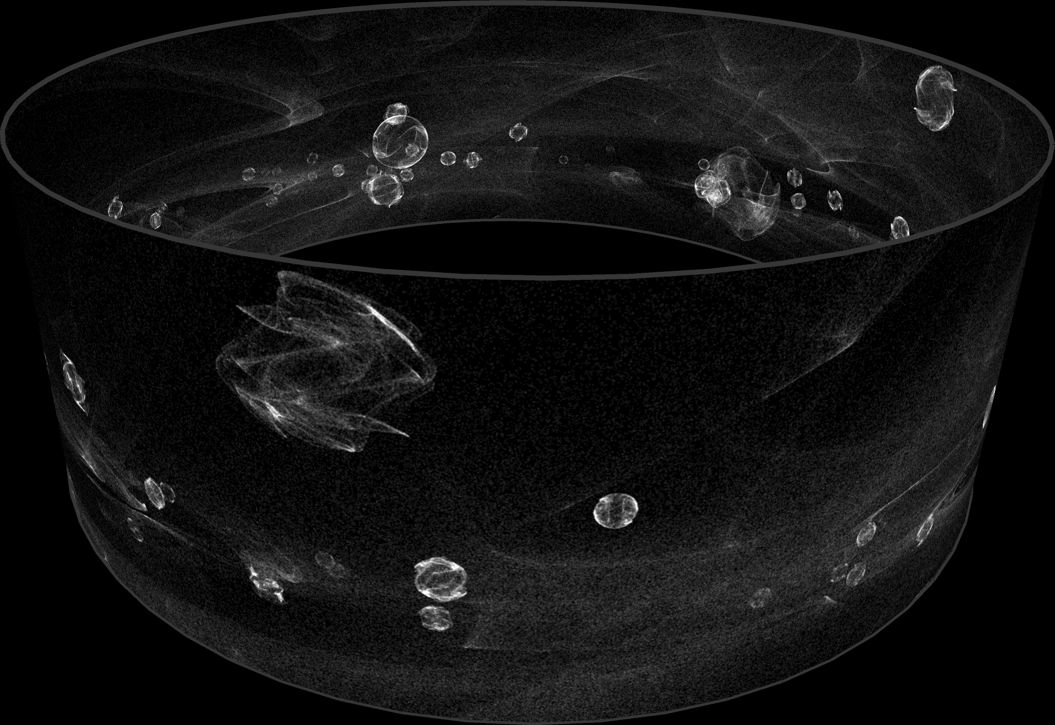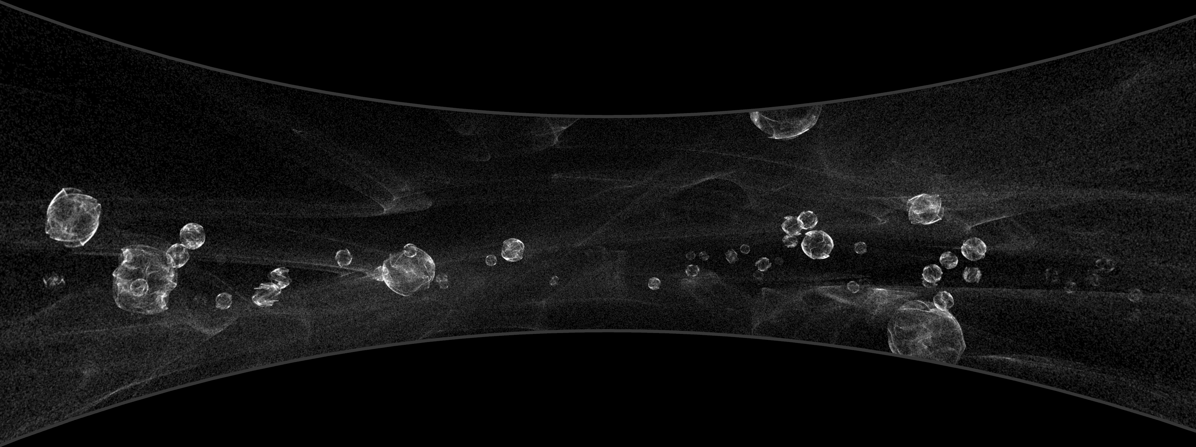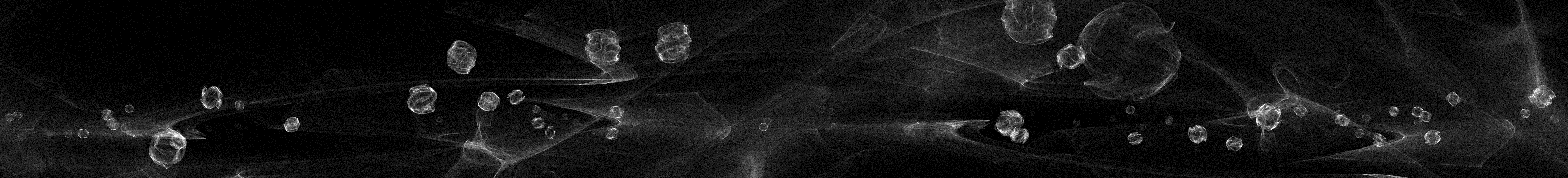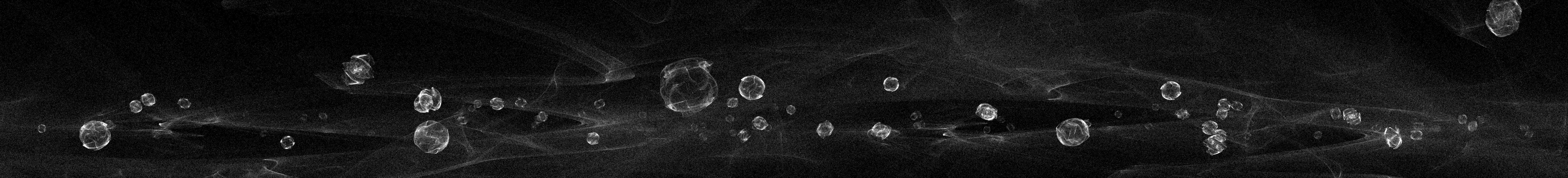 Using three-dimensional panoramic projection and sound calculations, the sound sources seem to float in the midst of space. The nebulas in the background are based on the same mathematics as the aviating, sphere shaped clouds of speech. Thus large and small scale, inside and outside view, share the same origin.